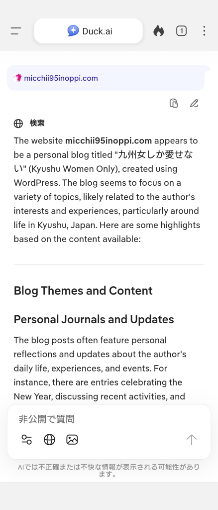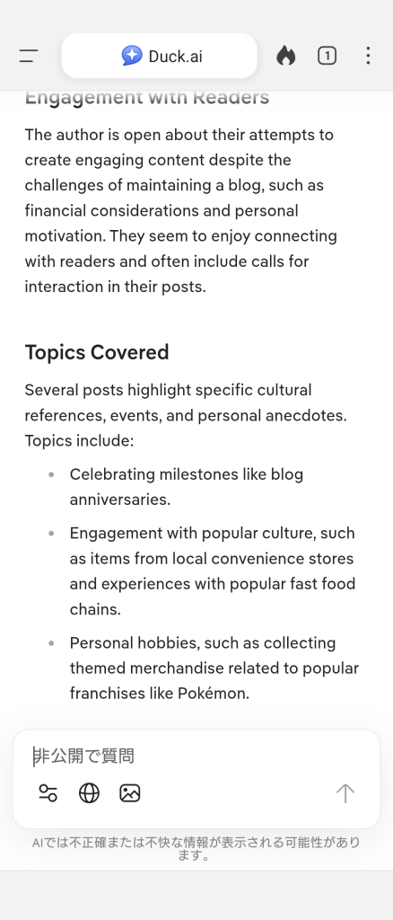 と、云うわけでDuckDuckGo様のAIを引用して自分のブログを恐る恐るどう思うか聞いてみたら帰って来た答えがこれでした。