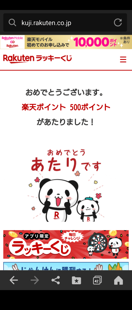 • 楽天ラッキーくじでまた2等500ポイントが当たった九州娘